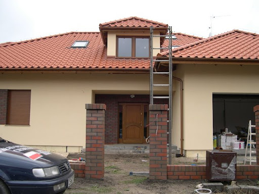 Nie wiedzieliśmy, jak zabrać się do wyboru koloru. Próbki na paletach są tak małe i tak - jak się okazało różnią się od tego, co w efekcie wychodzi, że przerażało nas to. W efekcie trochę na czuja wybraliśmy kolor, kupiliśmy jedną puszkę (15 l wrrrr, że też nie robią próbek) i pomalowaliśmy kawałek. Kolor nam się spodobał, ale wydawał się za jasny. Zaryzykowaliśmy i resztę kupiliśmy już bez próbowania farbę o ton ciemniejszą. I udało się - trafiliśmy w dziesiątkę. Bardzo mi się podoba ten kolor i według mnie świetnie pasuje do naszej dachówki i klinkieru. Jak myślicie?[/url]