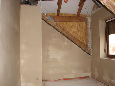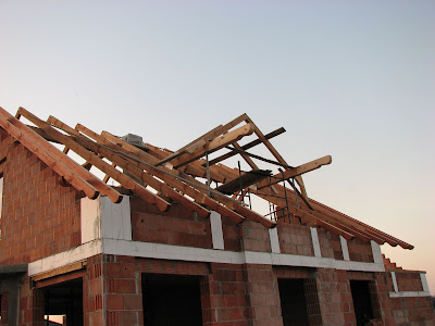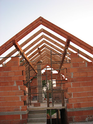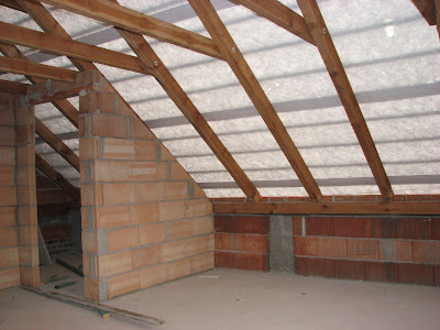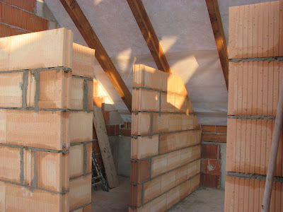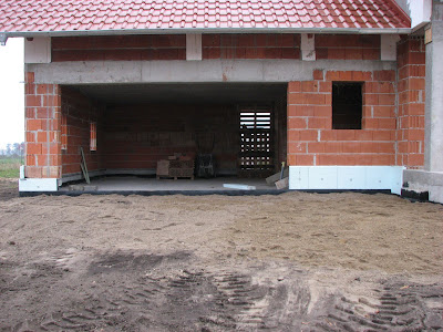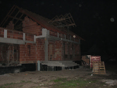 Cały czas czekamy na cieślę. Ubiegły tydzień trochę sobie olali, w tym tygodniu postanowili trochę podziałać. Efektem są...ścianki działowe na parterze. Trochę pozmienialiśmy, jednej nie budowaliśmy wcale (między jadalnią a kuchnią), dodaliśmy w garażu (pomieszczenie gospodarcze).