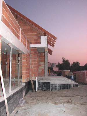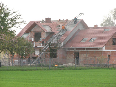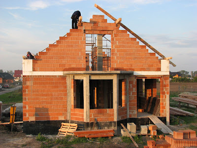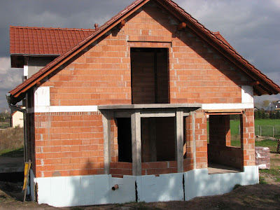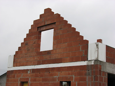 Dziś murują komin - ale jeszcze bez klinkieru, jutro mają wyrównać słupki wieńcowe, bo są nierówne, w poniedziałek ruszają z dachem. Mam nadzieję, że teraz już szybko pójdzie.