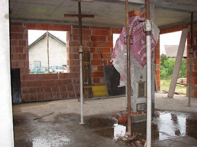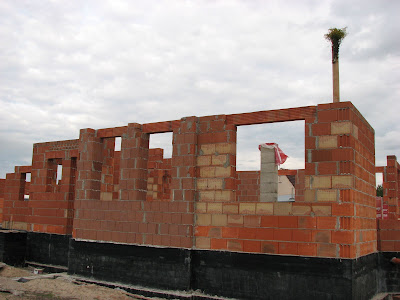Wykonawcy nieźle się uwineli i skończyli mury - widok ze stałego punktu widokowego - tym razem bardzo rozmoczonego przez piątkową ulewę. Reszta wykusza będzie wylewana razem ze stropem: