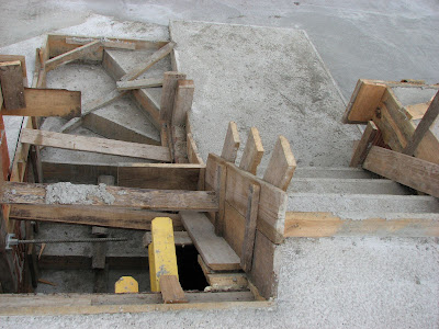 Tu dla szczęśliwych posiadaczy sokolego wzroku rozrysowane schody na betonie i ścianie - musieli chłopcy trochę pokombinować, bo wysokości się zmieniły (zmiana stropu), ale twierdzą, ze wyliczyli tak, że wszystko się zgodzi