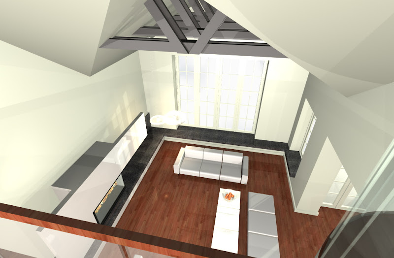 a na poddaszu zostawiamy też jętki widoczne, pomalowane na jaśniejszy szary niż jętki w salonie i robimy przestrzeń do końca, bez sufitu, z widocznymi z antresoli veluxami
