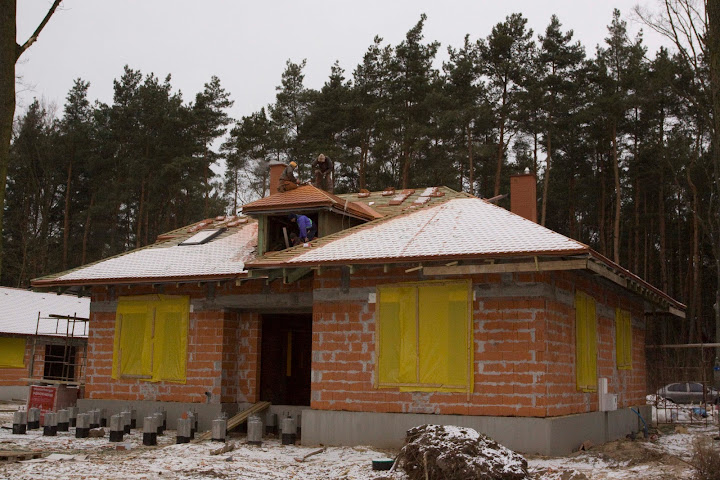 Na razie robota stoi - bo zimno, ale na początku stycznia w końcu został dom zakryty dachem :). Wygląda na to, że dach został całkiem solidnie zrobiony, lecz tak naprawdę zweryfikuje to dopiero wiosenna odwilż. Co prawda nie ma zrobionych okapów i rynien, ale przy tej ilości śniegu jaka spadła, to może i lepiej...