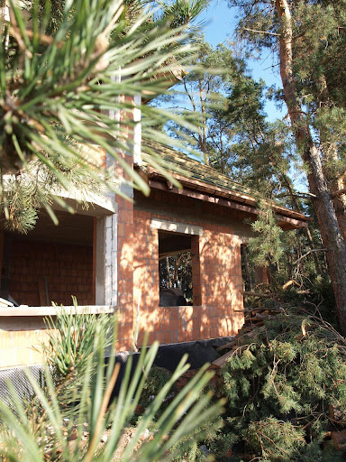 Tutaj tył domu, a na połaci widać zaczątek tego, co zdaje się, że przy domu w lesie będzie naszą stałą bolączką: igliwie na dachu. Że rynny będzie trzeba czyścić kilka razy na rok, a kosze przynajmniej raz na rok, dekarz nas ostrzega cały czas. Nic, do czyszczenia rynien zrobię jakieś ustrojstwo na drągu, a do czyszczenia koszy już zaczyna mi się rysować pomysł czegoś choć troszkę zautomatyzowanego jako temat do dumania w długie zimowe wieczory we własnym domu i własnym warsztacie