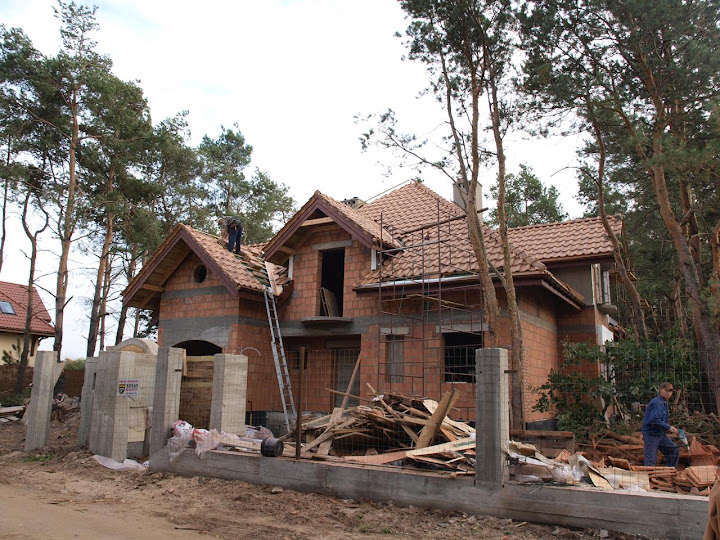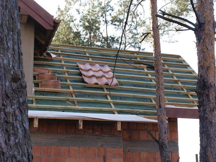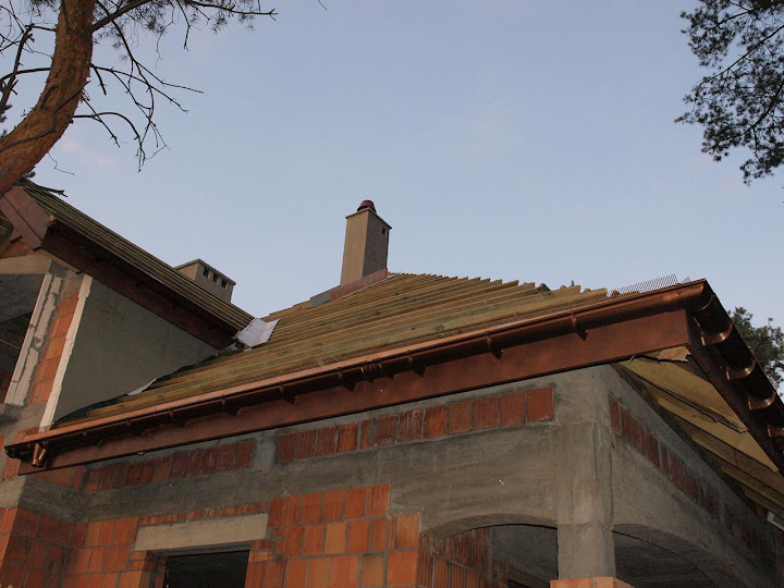 Dach niestety się przeciąga, pogoda dekarzy nie rozpieszcza, nieuniknione problemy logistyczne również. Teoria była taka, że do jutra mają skończyć. Niestety nie skończą, zostają im jakieś niedokończone drobiazgi, poza tym: