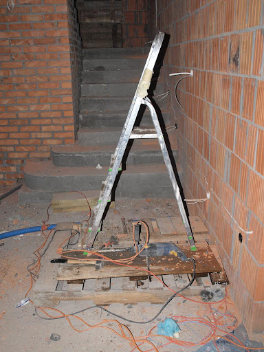 (mało to wyraźne w tej skali, więc opiszę, że na podłodze stoi paleta, na niej pozbijane z desek blaty, a na tym wszystkim drabina).