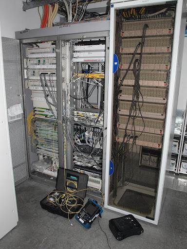 A w dziurze do szachtu instalacyjnego zaczynają się pojawiać pierwsze końce kabli czekające na główną tablicę rozdzielczą, która się w tym miejscu znajdzie. Póki co trzy (ten czwarty w poprzek, to prowizoryczne oświetlenie działające obecnie), ale będzie ich tam duuuuuużo.