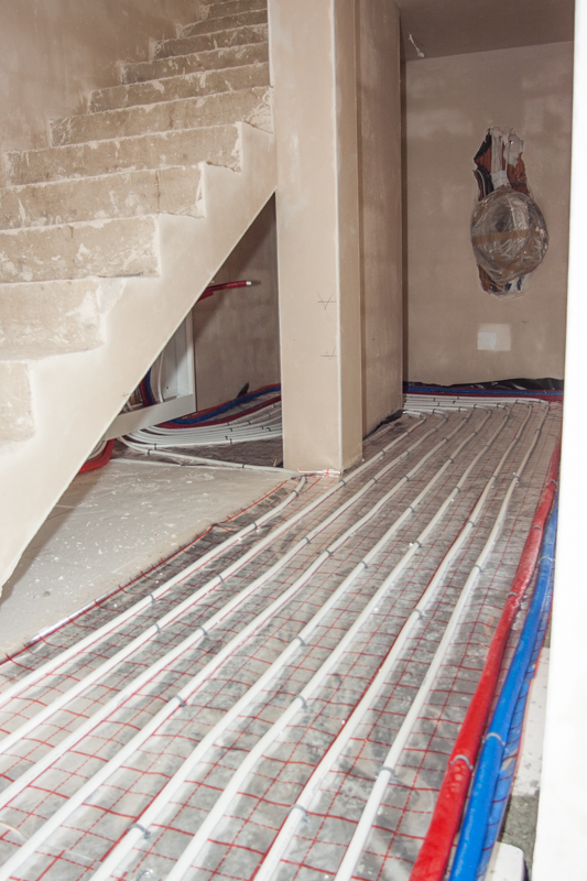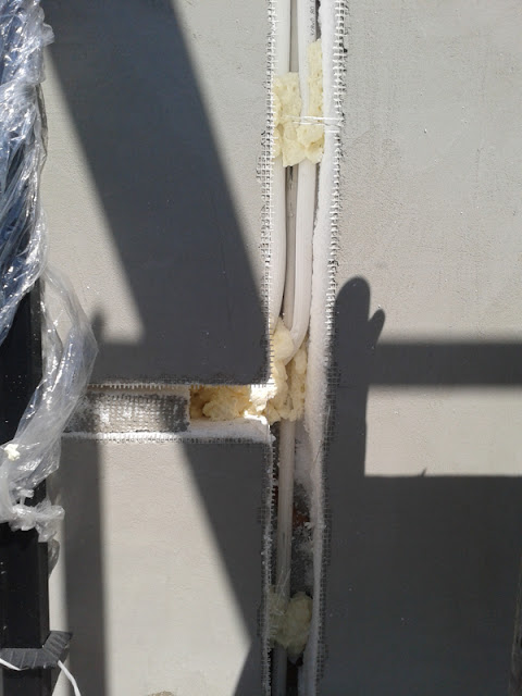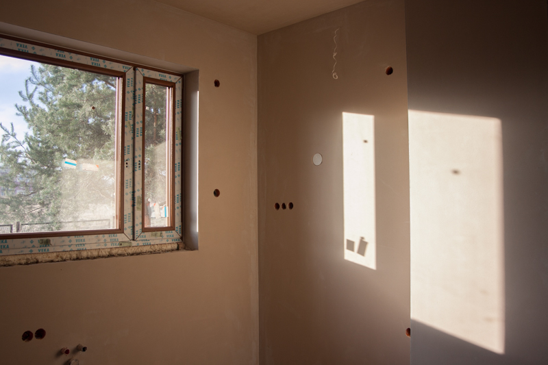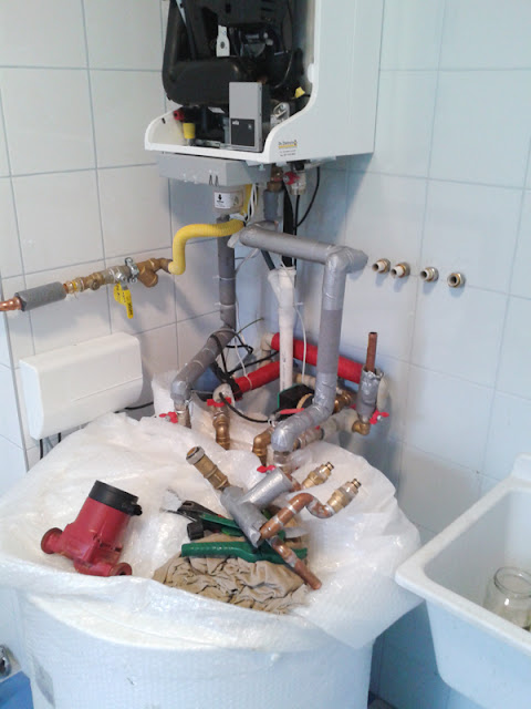 Aż tu zaraz na początku grudnia znów się zrobiło wilgotno i zacieki wyszły powyżej poprzednio narysowanej linii zasięgu wody na ścianach. W odkrywkowej dziurze w garderobie piasek zrobił się mokry. Tego samego dnia zauważyłem wodę kapiącą z wnętrza kotła gazowego. Okazało się, że złe (partackie) podłączenie odpływu kondensatu z kotła do kanalizacji powodowało, że część wody trafiała za zasobnik na podłogę, skąd jak sądziliśmy przez szczelinę w fudze (osiadanie podłogi na milimetr) dostawałaby się pod podłogę. Szybka akcja - nieskuteczna - dalej wyciek - poprawka kolejnego dnia już skuteczna. Jednak brak schnięcia.