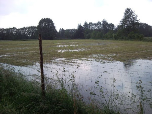Moje prowizoryczne wały zostały przerwane i woda znowu przepływała sobie strumyczkiem przez działeczkę. Na szczęści jest nieco pochyła i woda płynęła dale na łąkę sołtysa.
