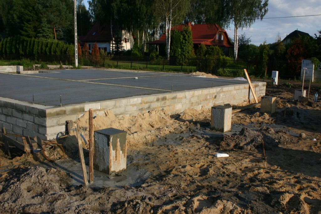Po przemyśleniach doszedłem do wniosku, że trzeba było wybrać całą ziemię i lać ławy w szalunki, po prostu nie podobało mi się, że zostało tyle ziemi w środku. Z wykonawcą zdecydowaliśmy się na wybranie jeszcze tej ziemi i zasypanie tego piachem. Po odstaniu paru dni ekipa znowu wpadła, wymurowała ścianę z bloczków, zasypała wszystko piachem, zalała szlichtę i 17go sierpnia osiągnąłem stan „0”.