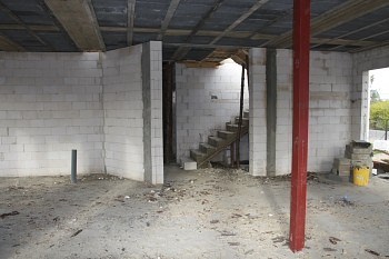 A tu, proszę wycieczki, stoimy w jadalni i widzimy część salonu z charakterystyczną złamaną ścianą i szarą rurą doprowadzającą powietrze do kominka (przynajmniej w założeniu miała do tego służyć, bo coś za daleko od komina wyszła ). Na wprost oczywiście schody, a pod nimi kotłownia. Po stronie prawej (tam, gdzie żółte wiadro) - wejście.