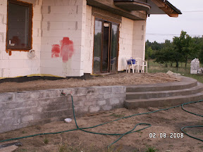 Mamy postępy w tarasach. Są już schody z przodu i z tyłu domu. Zdjęć frontu jeszcze nie mam, ale pokaże Wam taras od ogrodu, który teraz czeka na kostkę brukową.