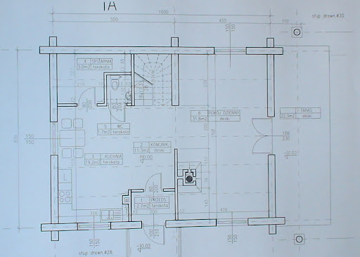 Tak, wszystko ustalone z Panią architekt czekamy na geodetę aby zrobił mapkę działki do celów projektowych. Czekamy i czekamy bo Pan geodeta nomen omen znajomy ma roboty tyle, że nie przerabia.Jest fajnie...W końcu po 2 miesiącach na początku grudnia mamy mapę. Hurra....Mapa trafia do Skierniewic. Tam Pani Małgosia nanosi nasz domek na naszą działkę wraz z przyłączami oraz garaż na nasze jeżdzidełka. W połowie grudnia projekt trafia w nasze ręce.