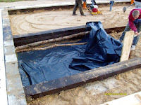 Po uklepaniu ziemii pod chudziaka zaczęli układać folię budowlaną, na której miało zostać wylane 10m3 chudziaka: