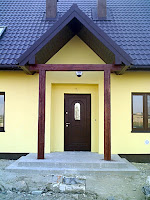 Trochę mieliśmy napiętą sytuację, bo chcieliśmy obrobić elementy drewniane przy wejściu, a bez rusztowania ani rusz... Na szczęście szef ekipy, która nam ocieplała domek zostawił w garażu część swego dobytku, w tym rusztowanie :) Sęk w tym, że dziś (w poniedziałek czyli, dla potomnych) to rusztowanie chciał zabrać i trza było korzystać z wąskiego gardła czasu
