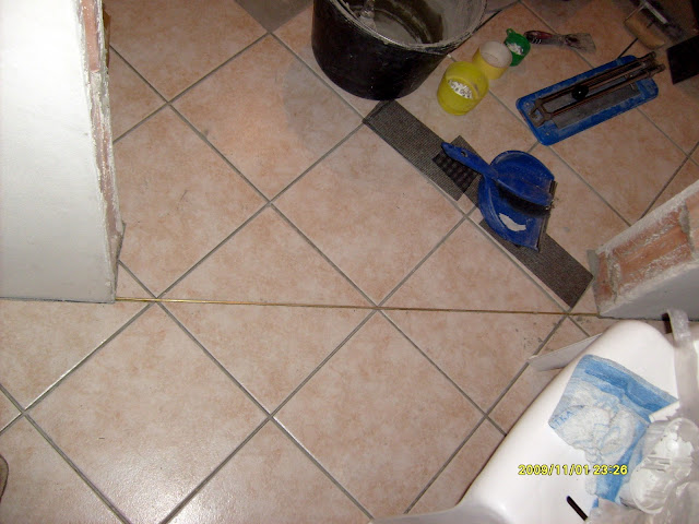 Teraz muszę obrobić glif przy drzwiach wejściowych, aby można było malowanko zrobić, potem fugowanie (tylko jaką fugą? ja chciałbym szarą, bo wkrótce każda fuga będzie tam szara i tak, ale Oz chce kolorową ). A, i jeszcze cokoliki trzeba porobić, tylko czy starczy mi płytek? W kuchni też...