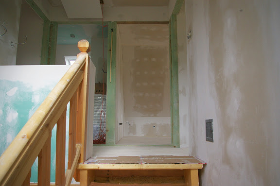A taką "ściankę" zrobiliśmy zamiast normalnej barierki.... Sąsiad stolarz nie miał chęci pomóc w zrobieniu normalnej barierki, ja nie miałem sił i ochoty poszukiwać jakiegoś stolarza, więc podczas spacerku ze Smolikiem wyimaginowałem sobie coś takiego..... Chłopaki od gipsów przy okazji szpachlowania ścian na poddaszu zrealizowali mój pomysł....