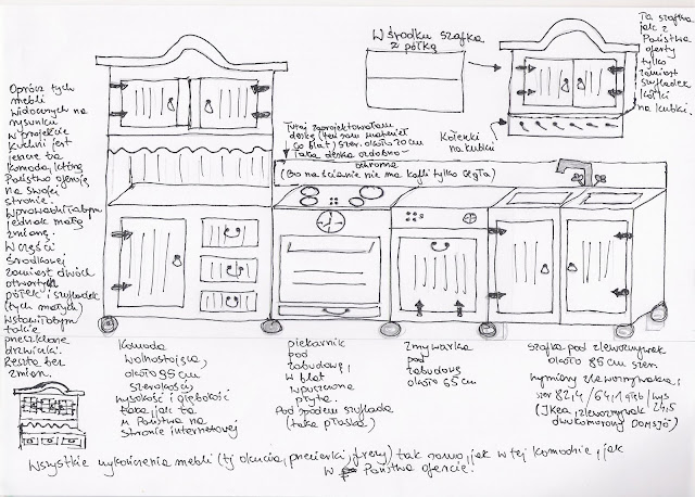 W międzyczasie żeńska część mypinków rozrysowała sobie projekt wiejsko- rustykalnej kuchni (te napisy pomocnicze to dla stolarzy, bo meble się już robią )