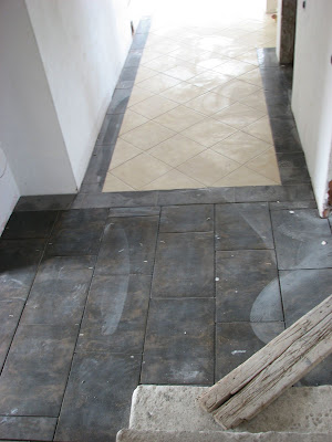 Zabrakło mi 3 paczek tych ciemnych płytek do korytarza, będą za tydzień. Płytkarze w poniedziałek będą ostatni dzień, potem wrócą żeby dokończyć układanie płytek przy drzwiach - dojście do framug, w kabinie prysznicowej na dole - bo będą się kończyły wewnątrz kabiny. Wtedy położą te brakujące ciemne oraz balkon.
