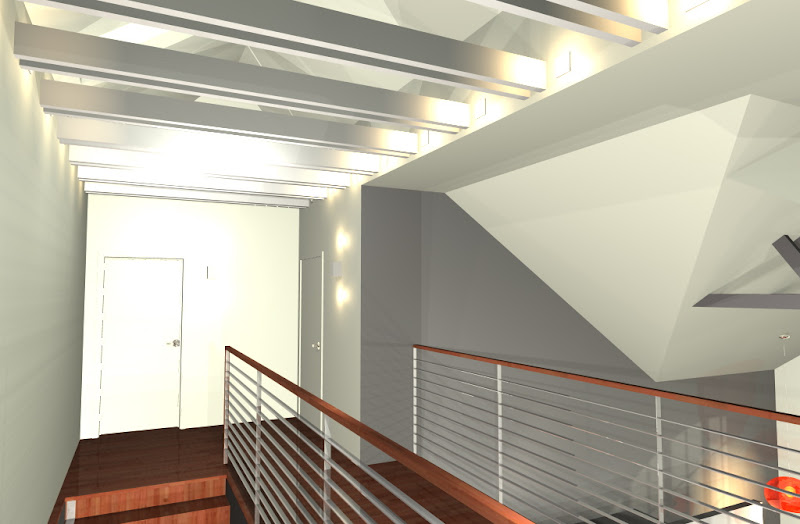 a na poddaszu zostawiamy też jętki widoczne, pomalowane na jaśniejszy szary niż jętki w salonie i robimy przestrzeń do końca, bez sufitu, z widocznymi z antresoli veluxami