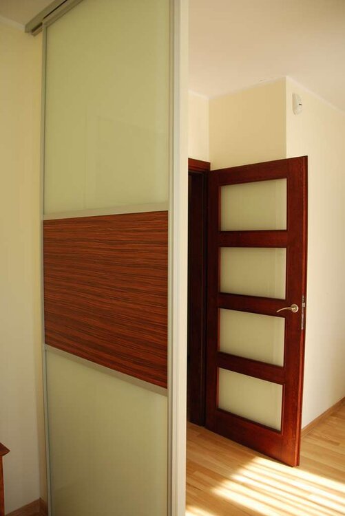 Drzwi nie wymagaja prowadnicy na podłodzie przez co podział pomieszczeń (np sypialnia / gabinet) jest bardzo estetyczny.