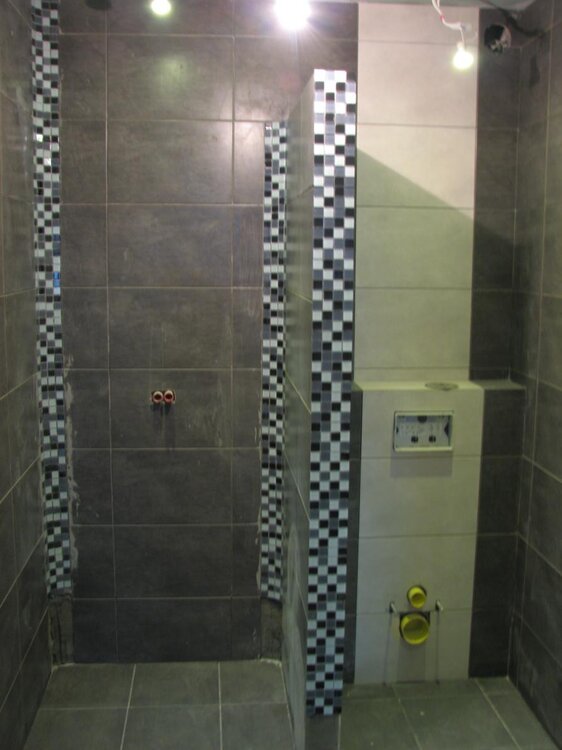 jeszcze tylko i show U bliskie spotkanie płytek przedpokojowych z łazienkowymi- te w przedpokoju już mają fugę i :i tu już wpełzły do wiatrołapu:D hihihihih:Dahah to taamto sierściowe pod drzwiami to wiadomo kto- Fred. ahah, jeszcze tylko dopowie-dopiszę, żeeeeeeeeee jutro wstawiamy(ja i Kubeł, no bo ja kobieta pracująca jezdem...) drzwi prysznicowe i K. zafuguje część łazienki i podokleja mozaikę , we wtornik dofuguje resztę i może zrobimy próbną kąpiel, kto wie, kto wieeeee........................ -