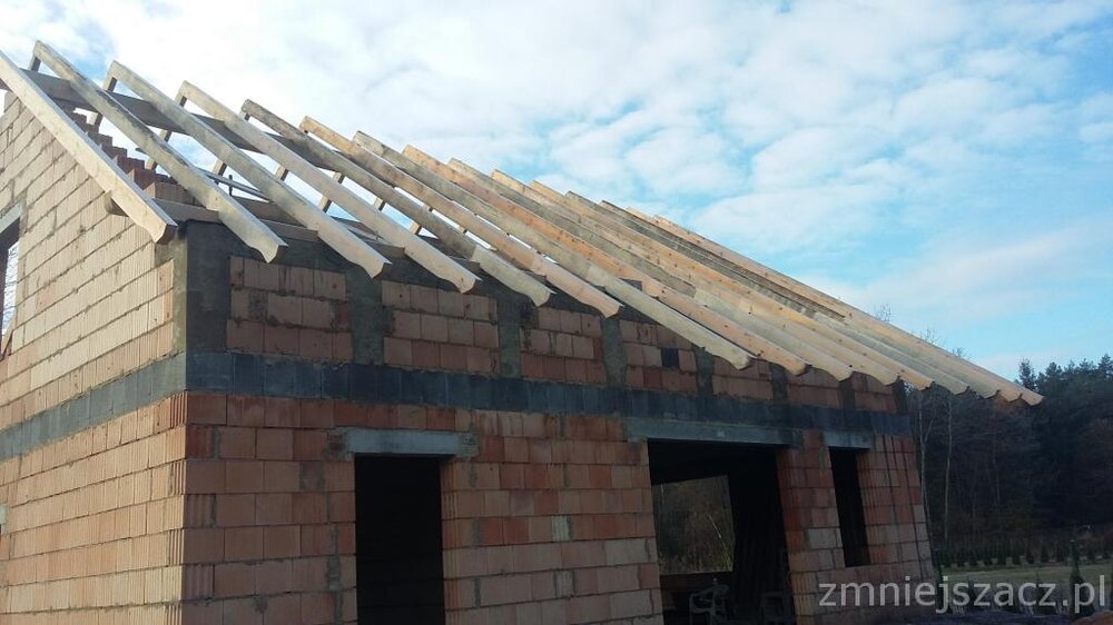 Hej Wam. Weekend minął mam chwile czasu więc postanowiłem wrzucić kilka zdjęć i napisać co robiłem. No więc wczoraj było ciężko i dużo roboty, przyszedł cieśla z 2 kolegami, ja i mój tato. Zaczęliśmy skręcać wszystkie bele belki i beleczki. Co prawda nie wszystko skończyliśmy w sobotę, zostały jętki, belki na zewnątrz i słupy w środku oraz na zewnątrz. To będzie robione we wtorek. Dzisiaj tj niedziela byłem poskręcać krótkie jętki które są nad tymi belkami do góry, reszta jętek we wtorek. Posprzątałem budowę, poszykowałem długie jętki do skręcania. Ogólnie dzisiaj było porządkowanie, wole mieć "czysto" na budowie. Jutro zamawiam podbitkę czy nadbitkę chyba to się mówi i deski na dach. Następny tydzień zleci na malowaniu nadbitki przy halogenie popołudniami. Jak pogoda dopisze w sobotę będę malował belki które już powoli mogę nazywać dachem. a może w niedziele lub sobotę popołudniu zacznę bić dach. Acha bym zapomniał w czwartek przychodzą jakieś majstry (jakieś bo ojciec ich załatwia) i będą wykańczać szczyty tak żeby już były na gotowo. Kilka zdjęć: I teraz 2 pytania do Was samoroby: 1. Czy szczyty te zęby wykańczać tym samym pustakiem którym był budowany cały dom? Czy może warto kupić te biale suporex chyba się nazywa i tym wykończyć? Ponoć można i jest o wiele łatwiej je dociąć. Ewentualną różnicę grubości uzupełni się styropianem. 2. Mam wielką ochotę zabić dechami i papą cały dach a na wiosnę dopiero wyciąć dziurę pod komin i wtedy go wystawić i dokończyć, pomysł wydaje się dobry bo już przymrozek i boje się że zaprawa i klej do ceramiki szlak trafi.Jak myślicie? -