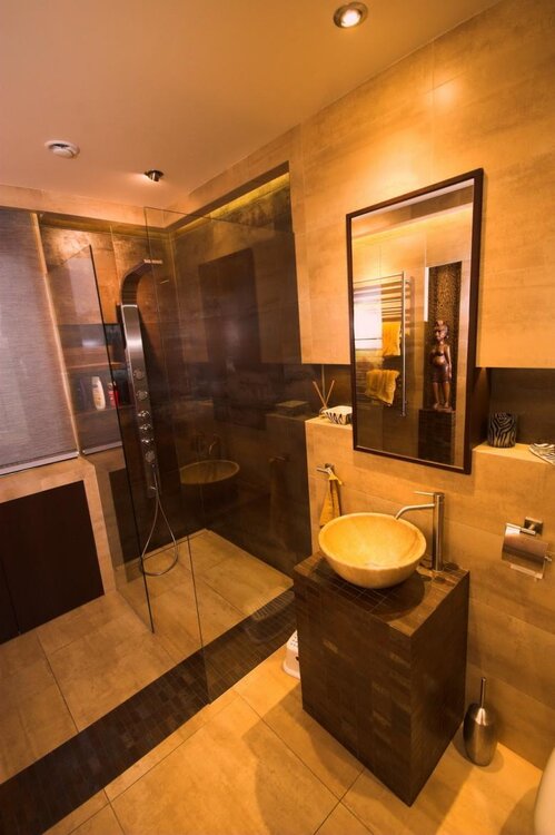 Ledy są oczywiście RGB - kolor sterowany na zachciankę. Przy wyłączonym pozostałym oświetleniu i np. długiej kąpieli w wannie robią klimat są nie do zastąpienia. Na co dzień mogą świecić na biało lub wcale. Aktualnie testujemy pomysł: rano ożywczo na jaskrawo zielony, potem w ciągu dnia niebieski, wieczorem czerwień grająca z promieniami słońca zachodzącego. Jeśli chodzi o pamiątki to bez nich, przynajmniej dla nas, te łazienki były by bez duszy, chcieliśmy je jak najbardziej spersonalizować. To super uczucie obcować ze wspomnieniami z dalekich wypraw. Łazienki są tematyczne, nie chcieliśmy żeby przypominały te z gotowych projektów, lub od Pani "Projektant" z centrum Łazienek. Pisuar - każdy facet go doceni, na zachodzie to już standard, dla nas osobiście skojarzenie z publiczną toaletą to raczej zapach, którego nie ma odkąd nie trzeba sikać do WC na stojąco. Jako Bidet służy mała słuchaweczka (bidetta) - podpatrzone w Azji. Cały dom (płaski dach + olbrzymie przeszklenia) jest w klimacie azjatyckim (pamiątki, pamiątki...), oprócz tej łazienki Afrykańskiej. Grzejnik firmy PMH, Szklane wieszaki dorabiane na zamówienie (wychodzi taniej niż oryginalne). Baterie i osprzęt Omnires. Pozdrawiam