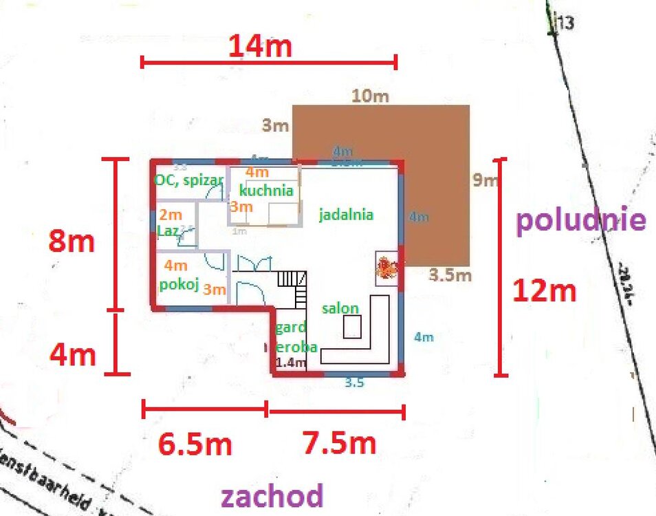 Powracam na forum. Witam wszystkich serdecznie. Mam czas na znalezienie albo idealnego projektu gotowego, albo zrobienie planu z Waszą pomocą, który posłuzy jako wytyczne dla architekta. Pewnie kilkoro z Was powie - czemu od razu nie pójdę do projektanta i nie powiem co i jak i zrobimy projekt indywidualny bez konsultowania Was, często ekspertów bądź ludzi z dużym i różnorodnym doświadczeniem, na forum. Otóż, mieszkam w Belgii i tutejsze projekty naprawdę nie powalają. Obejrzeliśmy kilka domów wykonanych wg projektów indiwidualnych w ramach dnia otwartego i na serio - wiele pozostawia do życzenia, a przynajmniej nam nie odpowiada. Chodzi mi o funkcjonalność, rozplanowanie pomieszczen a nie o same dekoracje. Wstępnie też spotkałam się z 2 biurami, wrażenie dobre, ale patrząc po ich projektach to albo klienci lekko podchodzą do tego jak dom jest zaprojektowany, abo nie wiem co.... Czym dysponujemy. Teren to 2tys m2, z czego uzytkowych ok 1700m2. Zabudowa w 2giej lini i wymogi, które wskazują na zabudowę w ramach obszaru zaznaczonego na mapie linią przerywaną [10m od granicy działki]. - max 200m2 zabudowy na parterze - wysokość max 8m [ale można pewnie z 0,5-1m więcej wynegocjować] - dach max 45st - charakter zgadzający się z okoliczną zabudową [brak tzw kostek]. - garaż do 35-40m2 może być osobnym budynkiem, max wysokość 3m i ten sam typ zabudowy/stylu co dom. Sytuacja na działce która wpływa na kształt domu to: - Wjazd/wejście od zachodu - lekki spadek ku północnemu-wschodowy, ale nie jest to 2m w obrębie zabudowy jak na mapie, ale max 1m w różnicy poziomów. Teren był niwelowany jakieś 30lat temu, ale jak widać ekspert od robienia mapek nie stwierdził za istotne aby zmierzyć i mapę zaktualizować [jedno z wielu oblicz lenistwa lokalnych expertów] Rozważania, dywagacje, chciejstwa, ale czy rozsądne?! - Wykorzystac jak najbardziej południową ekspozycję, duże przeszklenia, ale nie musi to być ściana ze szkła, drzwi przesuwane i duże okna wystarczą. - Duża częśc dzienna,tj kuchnia+salon+jadalnia 45-50m2. Czy to nie za dużo? - Kuchnia od wschodu, fajnie jakby była opcją czasem ją zasłonić całkiem, albo cały czas częściowo skryta, ale dalej otwarta. [choć na moim planie jest od zachodu...bo tak jakoś bardziej mi pasuje] - Wypoczynek mało widoczny z kuchni i vice versa. Stąd w mojej głowie zrodził się plan L. Widziałam na żywo domy gdzie kuchnia, jadalnia i salon są w jednej linii – nie podobało mi się to że z wypoczynku widać całą kuchnię. Obecnie mamy w L i jestem zadowolona. - 4 pokoje. Jeden były gościnno-gabinetowy. Jeśli domek z poddaszem to może 5 pokoi, jeden koniecznie na parterze. - pomieszczenia gospodarcze na szczotki,odkurzacze etc. - spiżarka kuchenna - pralnio-suszarnio-prasowalnia - jeśli dom będzie z poddaszem to nie chcę mieć schodów zupełnie odkrytych. Wolę mieć schowek na szczotki albo wolną przestrzen. - chyba sobie odpuścimy kominek. Mamy teraz i używamy sporadycznie tylko dla zabawy. W sumie podobają mi się domy z poddaszem, ale może warto zmaksymalizować te 200m2 i zrobić dom parterowy, może ewentualnie z takim luźnym pomieszczeniem na poddaszu. A część dzienną zrobić wysoką do samego dachu? Może kojarzycie jakiś gotowiec, który mogłabym wykorzystać jako inspirację? Kiedyś narysowałam sobie luźny plan. Ale jeśliby wymiary zostały zachowane to salon i jadalnia miałyby ok 90m2 – haha. No i plus kuchnia... to już w ogóle hahaha! Teraz ten plan trochę przerobiłam i zrobiłam z niego parterówkę. Część kuchnia+jadalnia+ salon wyszło ok 70m2 więc .dużo. w dodatku strasznie duża przestrzen wyszła korytarza, a od wejścia do domu i przejścia do części dziennej to już boisko. No i kuchnia od zachodu, a wolałabym od wschodu. Pok 1 – ok 3.5x4m Pok 2 – wraz z garderobą ok 5x4 Pok 3 – ok. 3x2.5 więc klitunia Pok 4 - 3x3 więc klitunia Pok 3-4 można by przesunąć w prawo i dojście do gabinetu byłoby „ukryte”. Ponadto jeśli byśmy chcieli dać schodu na poddasze to można zrobić może kolo pok 2. Przez to że wejście musi być od zachodu [od południa jakoś mi się nie widzi, pozatym chyba od południa zwykle się nie robi] to dom na podstawie prostokąta chyba nie wchodzi w grę? A może się mylę? Poniekąd podobają mi się domy w kształcie L ale nie będę się upierać bo pewnie i dach sporo droższy jest. Strasznie długi się ten post zrobił. Może za długi i nikt go nie przeczyta i przez niego nie przebrnie. A teraz proszę o konstruktywna krytykę, uwagi i sugestie [powyższych wywodów jak i mojego "planu" zrobionego ręcznie, nie mogę usunąć poprzedniego całościowo zrobionego w paintcie]. Z góry dziękuję.