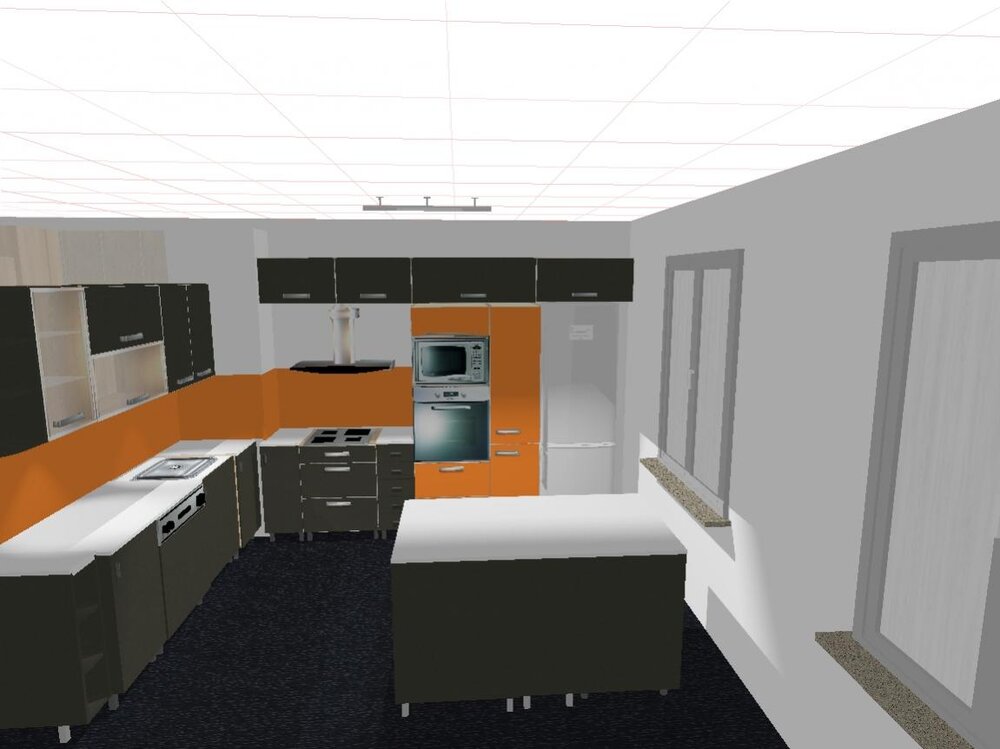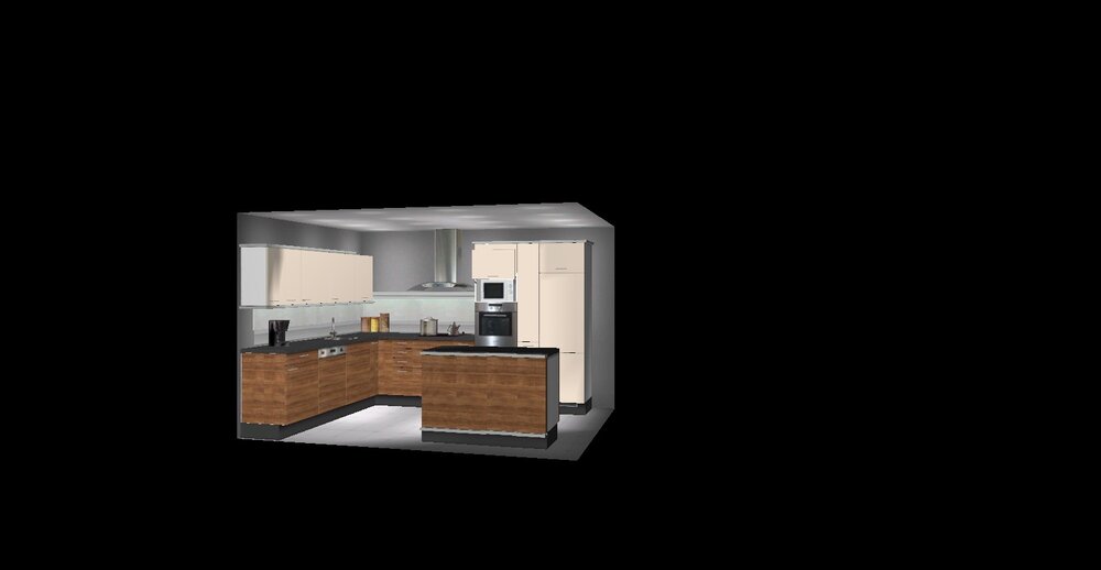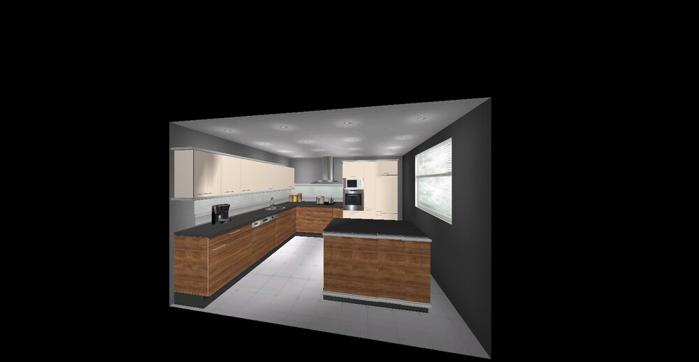 Anulek2005 ciekawa kuchnia (jakiej wielkości ona jest). Trochę nie wiem czy bym się zdecydowała na taką dużą wyspę bo jednak spor miejsca zajmuje. Z tego co widzę to z lodówki wcale nie masz blisko do głównego blatu Na zdjęciu wydaje sie jak byś musiała dużo więcej przejść niż ja . Ciekawa jestem jak będzie wyglądała w realu. Ja zrobiłam nowy projekt swojej kuchni ( układ ten sam) Od razu zaznaczam że niedociągnięcia kolorystyczne tzn listwy i takie tam są niedopracowane bo miałam problemy z programem który jest po angielsku Kolory Frontów to śliwa Wallis albo orzech amerykański a na górze to Wanilia połysk. Jakoś fajnie tu wygląda ten czarny blat i szara ściana. Ten pasek na ścianie to ma być prawdopodobnie po prostu szyba.