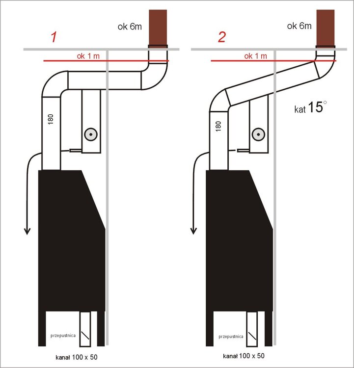 Wielkie dzięki za pomoc. Rzeczywiście podmieszania wody BRAK. (w kominku pompy załączają się przy 58 stC) i temperatura w płaszczu w trakcie palenia zwykle utrzymuje się na poziomie 67-54 stC). Mam sterownik Tatarka (załączenie pompy CO regulowane jest w przedziale 30-60 stC, chyba że zamienić podłączenia CWU regulowane 20-85 stC) . Drewno świeżyzna, z tego lata + zostało mi grabu około 1,5 m z zeszłego roku i paleta brykietu. Spróbuję popalać samym brykietem może się polepszy zanim rozbiorę to ustrojstwo. Widzę że jedyne rozwiązanie to własny magazyn drewna ( właściciel pewnego składu drewna powiedział mi, że sezonowanego drewna nigdzie nie kupię zbyt chodliwy towar żeby leżał i czekał na swoją kolej, a jak ktoś tak twierdzi to kłamie.) Acha, zawór trójdrożny mam ale jako zabezpieczenie w przypadku przekroczenia 90 stC otwiera się zawór dopuszczający zimną wodę do obiegu płaszcza. Podsumowując: 1. dorobić podmieszanie wody w obiegu płaszcza przed kominkiem 2. przeróbka obecnego "załamanego" odprowadzenia spalin ( czy schemat z prawej strony "ze spadkiem" nie będzie kolejnym bublem?, czy nie brakuje gdzieś dodatkowej rewizji lub innego elementu?) 3. uszczelnienie (wymiana obecnego dekla) przewodu spalinowego 4. zmiana odprowadzenia skroplin (obecnie rzeczywiście jest podłączony do rurki przelewowej z naczynia wzbiorczego, (jak inaczej można to wykonać, lub zabezpieczyć przed lewym powietrzem) 5. zakup suchego drewna Instalatorzy dali ciała ( co prawda usytuowanie komina super pomysł), ale chyba powinni to przewidzieć. WIELKIE DZIĘKI ZA POMOCNE UWAGI. Proszę o jeszcze. Dzięki