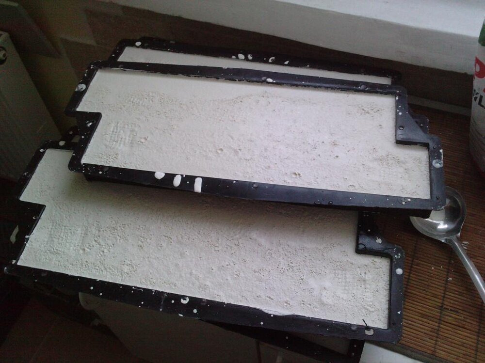to 1,5kg gipsu i 1,1l wody na jedną płytke ale można mieszać cement,piasek z gipsem itp