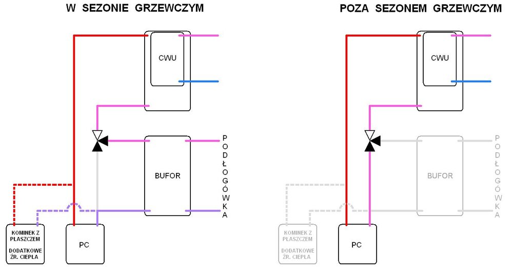 Witam Szanownych Forumowiczów. Proszę o poradę od instalatorów. Jak z głową połączyć następujące elementy systemu grzeczego: 1. Pompa ciepła (główne źródło ciepła). 2. Zbiornik CWU (wbudowane mają ok. 170 litrów, więc może być troche mało, może więc oddzielny, powiedzmy 250-300 litrów) 3. Kominek z płaszczem wodnym odpalany raczej rzadko niż często (dodatkowe źródło ciepła). Chciałbym, żeby kominek pracował z priorytetem dla CWU. Po głowie chodzi mi pomysł, żeby wodę z kominka puścić najpierw przez wężownicę w zbiorniku CWU, a potem szeregowo do bufora CO. A może przydałby się zbiornik w zbiorniku? Żadnego zakupu jeszcze nie dokonałem, więc wszystko do ustalenia. Ogrzewanie nie powinno pochłonąć u mnie ogromnych ilości ciepła, gdyż dom będzie porządnie ocieplony, z ciepłymi oknami i wentylacją z rekuperatorem. Natomiast woda jak to woda - gość w dom - i... no, nie powinno jej zabraknąć po pierwszej kąpieli. Dzięki.