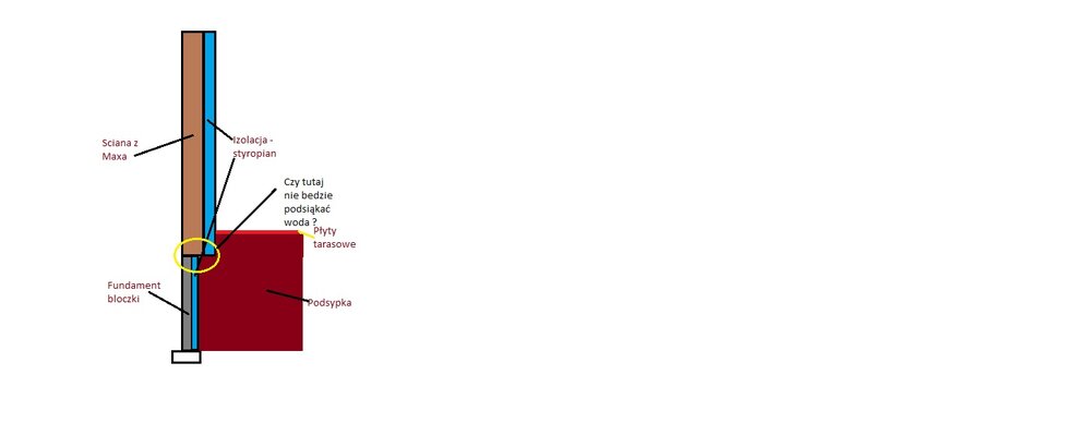 Witam serdecznie. Właśnie jestem na etapie wykonywania tarasu na gruncie z płyt tarasowych. Taras umiejscowiony jest we wnęce między 3 ścianami budynku. Chciałbym aby poziom tarasu był minimalnie poniżej poziomu linii okien, tak aby nie trzeba było wykonywać schodka przy wyjściu z domu na taras. Niestety poziom wypadnie mi wtedy powyżej łączenia ocieplenia ściany i fundamentów. W związku z tym mam pytanie czy w miejscu zaznaczonym na żółto na rysunku nie będzie podciągać woda?