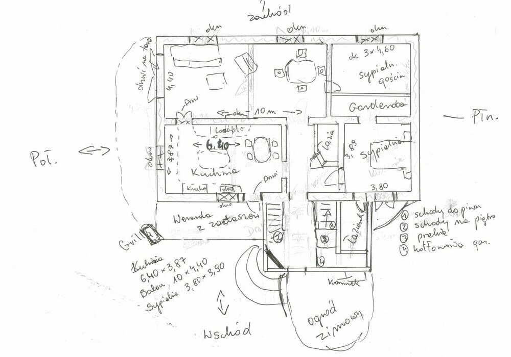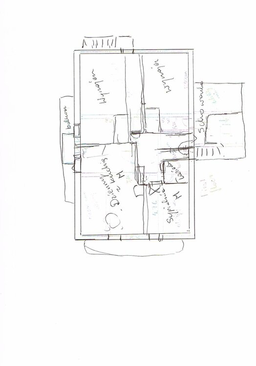 Witam, przyznam, że myślałam o podobnym rozwiązaniu, ale: działka od strony półn jest mała i mylałam, zeby zrobić tam schody zewnętrzne i połowę piętra wynajmować, więc potrzebne też miejsce na samochody, Na drugą część chcę zrobić schody z domu (mieszkanie dla mamy, być może dzieci; w późniejszym czasie chcę zapewnić mamie pokoik na dole. Ponadto, w podwórku (jak to na wsi) jest budynek gospodarczy tam można zrobić garaż. Zanim zacznę rozmowy z projektantem chciałabym mieć gotową wizję, w miarę dostosowaną do potrzeb, stylu życia i żeby to ładnie wyglądało i za nic nie wiem jak to pogodzić. Może to pomoże: budowaliśmy już wcześniej dom wg powszechnie przyjętych zasad i nie ze wszystkich rozwiązań byłam zadowolona: Z kuchni chciałabym mieć wyjście na werandę, żeby się ochłodzić jak coś gotuję, zrobić grilla bez przechodzenia przez salon (nie lubię biegania przez cały dom po każdą łyżeczkę, niepotrzebnie brudzi się w salonie); czy po prostu otworzyć drzwi - mam tak w domu w który teraz mieszkam i w lato to jest kapitalne, dlatego boję się robić oranżerię przy kuchni bo wiem jaki tam skwar panuje w lato gdy się gotuje. Nie wiem jak rozwiązać sprawę wychodzenia na ogród w ciągu dnia w przypadku wejścia od drogi ponieważ: relaksuję się przy uprawie warzyw, zabawie z psami, a nawet samo wyjście po marchewkę było problemem w poprzednim domu - najczęściej przez salon (bo najbliżej)i efekt: drugie buty w salonie albo brudna podłoga. Jeszcze coś, prawdopodobnie będzie trzeba rozebrać dom do fundamentów i na starych postawić nowy, (myślałam o przesunięci go w głąb działki, ale ona jest najszersza od drogi i musiałabym zburzyć duży budynek gospodarczy, żeby mieć fajny ogród, no i sypialnię chcę mieć na dole. Może kilka słów o sobie pozwoli pomoże: Wracamy do pl za kilka lat, więc budowa rozłoży się w czasie, ja na chwilę obecną chcę zostać w domu, (mam nadzieję, że wynajem drugiego domu i poddasza tutaj zapewni mi skromny byt), mąż w zależności od potrzeb może pracować. Nie wiem jeszcze czy będziemy mieszkać sami z mamą, czy może pojawi się jakieś dziecko, Ale zarówno mąż jak i ja lubimy spędzać czas na zewnątrz, planujemy jakieś warzywka, kilka kur, kurczaków, 3 psy, może konia, więc trasa dom - ogód (podwórko) będzie dosyć często uczęszczana więc nie mam pojęcia jak to wszystko pogodzić z obowiązującymi obecnie trendami w budownictwie. wklejam plan działki, może to coś pomoże, no i bardzo proszę o poradę, sądzę, że lepiej wcześniej wszystko ustalić i znaleźć architekta niż czekać do lata.