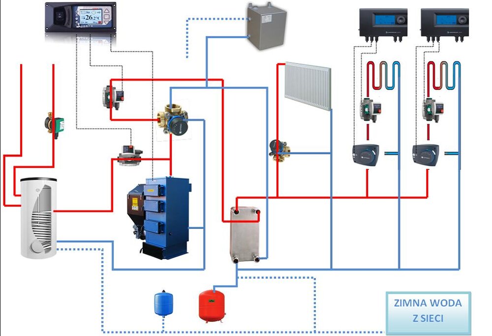 Witam, wreszcie udało mi się przebrnąć przez 11 już stron wątku... ufff jestem użytkownikiem Kotła SKAM P-Premium 25kW z COBRĄ, świadomie używam ich od początku tego sezonu. Moja instalacja wygląda w skrócie tak: kocioł-CWU- bezsesnowny zawór 4d rozkręcony na maksa -wymiennik- za wymiennikiem podłogówka na zworze z siłownikiem sterowanym eurosterem11M oraz grzejniki ( zawór 3d rozkręcony na maksa) na schemacie brakuje wielu szczegółów, oraz są takie, które w rzeczywistości trochę się różnią, wybaczcie, ale już mnie mdli od tego tematu i straciłem ochotę na ciągłe modyfikacje... Pod Cobrę podłączyłem pompę CWU oraz pompę podającą na wymiennik Po walce z błędami w instalacji, i doprowadzeniem jej do "w miarę" akceptowalnego stanu, przegryzam się ze sterownikiem. W tej chwili wiele rzeczy się rozjaśniło, ale pozostaje jeszcze kilka nurtujących mnie pytań, o tym niżej. Powierzchnia jaką grzeję tego sezonu to ok 280 m2 ( z tego 80 m2 piwnicy grzejnikami, parter i piętro podłogówką), gazobeton ocieplony 15 styropianu i prawie 40 wełny w skosach+ 40 strop. Nastawy jakie mam u siebie: CO 55st bez stref CWU 50 st ( grzane dwa razy w ciągu doby) podajnik zaleceń Jareckiego , góra dmuchawy 80 dół 5 min. moc kotła 1 % przedmuch wyłączony Póki co najbardziej zastanawia mnie stabilne zużycie niezależnie od tego czy na zewnątrz jest -20 czy +5, podajnik starcza na 4-5 dni. Dylemat mam także z ustawieniem pomp, mianowicie w instalacji mam model WILO STRATOS Pico, same pompy maja ustawienie pracy zilustrowane wykresem prostej płaskiej oraz wznoszącej się, do tego posiadają również możliwiej pracy nocnej(?) zastanawiam się jak to ustawić, żeby współgrało z ustawieniami w COBRZE, tj. skokowo czy płynnie, dotychczas pracują w trybie płynnym, zarówno CWU jak i wymiennik na wysokość ponoszenia 1m. btw zgadzam się z wypowiedzią Jareckiego, dotyczącą SHARKa, sam chętnie korzystałbym z takiego gadżetu ( do kotłowni schodzę średnio 5 razy dziennie )