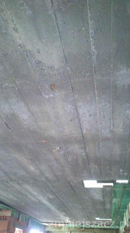 Witam! Jestem już z potężną paką zdjęć Więc tak: rozszalowaliśmy około 60% stropu. Na razie wszystko w miarę ok. Na stropie skakałem (około 95 kg), uderzałem sporym młotkiem bo chciałem poczuć jakieś drgania, sprężynowanie albo coś - NIC. Sztywno tak jakbym stał na chodniku w środku miasta. Wrażenie bardzo pozytywne. Po zdjęciu desek z tych 60% chciałem zobaczyć jakieś ugięcia - NIC. Przykładałem do sufitu długie deski, poziomicę 1,5 m - NIC. Być może coś wyjdzie na tych 40% to dam Wam znać ale na razie całkowicie się uspokoiłem. Wrzucam Wam dwa miejsca gdzie beton nie pokrył dobrze zbrojenia - nie wiem czemu. Skoro byłą dolana woda to tym bardziej powinien być bardziej płynny i powinien wpłynąć w każdą szczelinkę - nie wiem czemu nam nie pokryło w trzech miejscach? Poniżej zdjęcia. Rozszalowaliśmy też jeden słup i tutaj też trochę lipa ale to laliśmy z betoniarki z dodatkiem kruszywa. Również poniżej załączam zdjęcia. Czekam i proszę o merytoryczne opinie. Pozdrawiam -