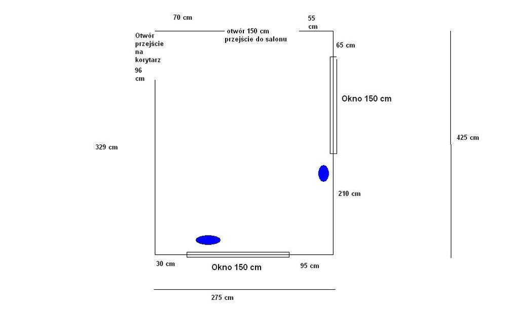 a) W tej chwili nie umiem powiedzieć jaka będzie odległość okien od podłogi gdyż nie ma jeszcze parapetów ale zapewne będzie to standart ok 90 cm. b) Jak narazie odpływy wodne są doprowadzone tam gdzie są niebieskie kropki na rysunku (dołączam nowy rysunek) ale ich zmiana również nie będzie kłopotem. Reszty przyłączy jeszcze nie ma. c) Jeśli chodzi o kuchenkę to będzie to płyta indukcyjna i oddzielnie piekarnik. Lodówka 60 cm Zmywarka 60 cm Jak narazie nie posiadam żadnych sprzętów które bym wykorzystał, wszystko będzie kupowane. Jeśli chodzi o stolik to chciałbym dowolne miejsce do zjedzenia np śniadania dla 2-3 osób.
