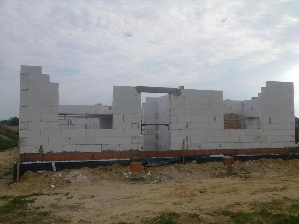 3. Dołączam kilka zdjęć. Mury już praktycznie na ukończeniu. Tak jak pisałem wcześniej zrezygnowaliśmy z garażu, w to miejsce pokój (garderoba) i pralnia. Okno w salonie powiększone, a zmniejszone to w najmniejszym pokoju.