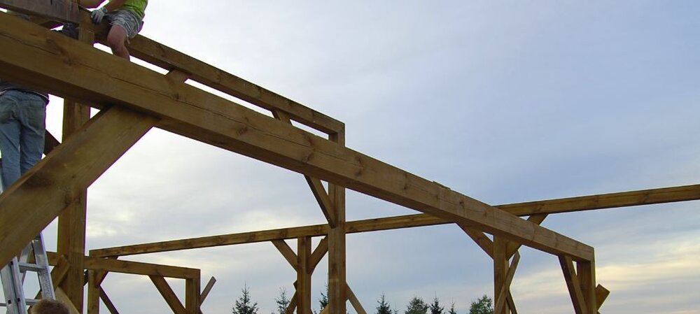 murłaty i słupy 16 x 16, krokwie zwykłe 8 x 20, krokwie koszowe i narozne 16 x 22, docelowo pełne deskowanie i dachówka 45 kg na m2