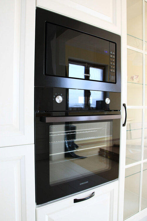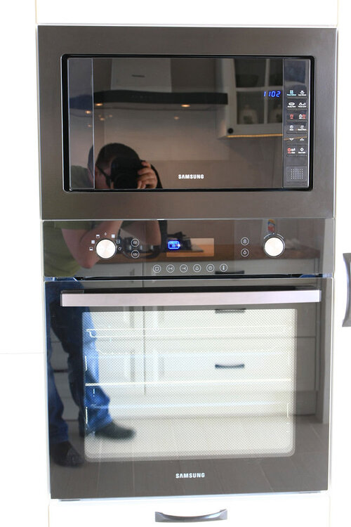 Bayzone, spełniam Twoja prośbę i wstawiam foty piekarnika (Samsung BQ1D6G144) i mikrofali (Samsung FG87SUB). Pomimo, że ramka jest taka półmatowa, zegary nie są w jednej płaszczyźnie, a mikro to model wolnostojący przystosowany do zabudowy, to cały zestaw prezentuje się dobrze. Na plus zasługuje zimna szyba piekarnika przy temp. 250°C, no może lekko ciepła, ale na pewno się człowiek nie poparzy, jak przy mojej obecnej starej Amice.