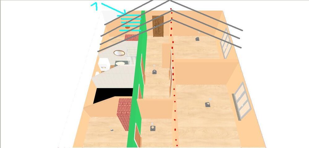 spytam jeszcze o sposób postępowania w jednym miejscu, tak wygląda moje piętro: dom przykryty jest dachem dwuspadowym, kalenica przebiega mniej więcej nad czerwona przerywaną kreską. nad dwoma dużymi pokojami i korytarzem jest strop. docieplając poddasze będę musiał wykonać "sufit" w pomieszczeniach na poddaszu, tak jak to zaznaczyłem na rysunku liczbą 1. oto moje wątpliwości: 1) membranę paro-przepuszczalną i wełnę pomiędzy krokwie umieszczam na całej linii krokwi znajdujących się w pomieszczeniu, czy tylko do tego tworzonego sufitu? 2) ten sufit mam zamiar wykonać z płyty osb ciętej na pasy szerokości równej szerokości krokwi tj 15 cm. następnie montować ją na sztorc do krokwi i do przeciwległej ściany. nad płytą osb mam zamiar rozwinąć membranę paro przepuszczalną, następnie pomiędzy pasy płyty osb powkładam wełnę mineralna 15 cm i potem jeszcze raz 15 cm wełny w poprzek, następnie profile do re-gipsu potem folia paroizolacyjna i głyty gk. Dobrze kombinuje z tym sufitem?