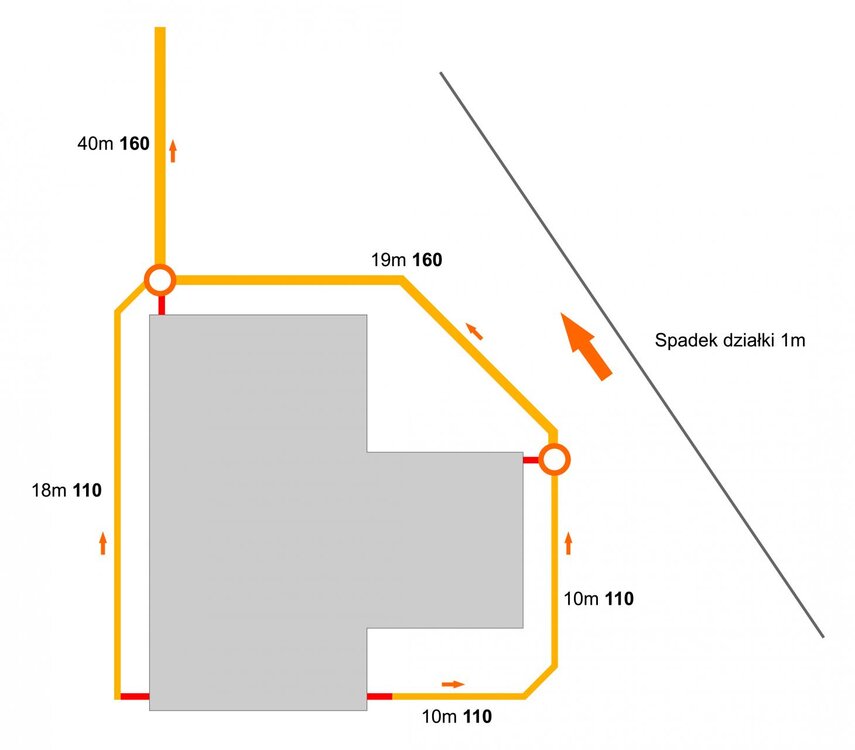 Witam, mam dach 360m2, 4 rury spustowe. Działka ma spadek około metra. Dołączam szkic jak planuję zrobić odwodnienie pomarańczowymi rurami. Planowane są 2 studzienki. Czy takie coś jest ok?