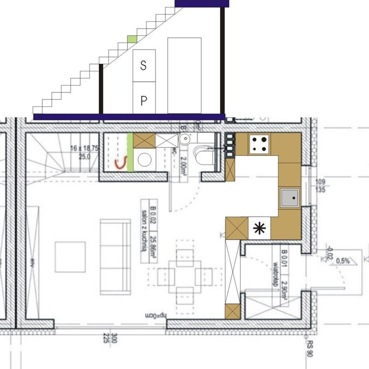 Pralka i suszarka w słupku powinny się zmieścić pod schodami a obok nich cargo ok.40cm. Miskę wc przesunęłabym w prawo, tak żeby było 20cm odstępu od ściany z drzwiami, co da po lewej miejsce na blat/szafkę ok.30cm. Umywalka w takim miejscu żeby nie przeszkadzała w wysuwaniu cargo. Niestety traci się przestrzeń w głębi łazienki. Łazienka ma jakieś 105cm szerokości czyli za mało na pralkę i suszarkę ustawione obok siebie w poprzek a przy ustawieniu wzdłuż zostałoby 40-50cm przed nimi - pewnie nawet drzwi pralki by się nie otworzyły nie mówiąc o kucnięciu albo schyleniu się w takiej ciasnocie. Z zabudową kuchenną można wyjechać trochę dalej niż na rzucie oryginalnym i zakręcić meblami na ścianę z drzwiami wiatrołapu. Na moim rysunku przykładowo jest szafka narożna 80x80cm, lodówka 60cm i słupek z piekarnikiem i mikrofalą 60cm - zabudowa wystaje na ok.40cm i takiej głębokości jest pawlacz nad drzwiami wiatrołapu i słupek meblowy po prawej. Wejście do kuchni ok. 94cm.