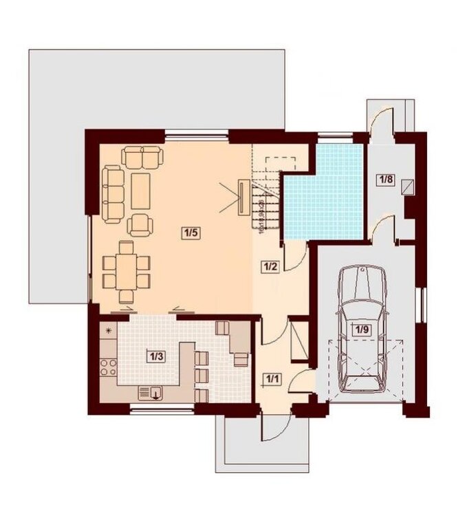 Teraz rzuty, tak wyglądał w oryginale: A tak wygląda po zmianach: wyrzucenie spiżarni i WC na rzecz większej kuchni, pomieszczenie gospodarcze zmienione na łazienkę, wejście do kotłowni przez garaż, W salonie zmiana jednego okna tarasowego na zwykłe okno takie jak w kuchni. Wyrzuciłem też kominek z salonu. Góra pozostanie taka sama, no może tylko jeszcze się zastanowię nad wyrzuceniem okien dachowych. Jeżeli ktoś ma jakieś inne pomysły albo komentarze to chętnie poczytam -
