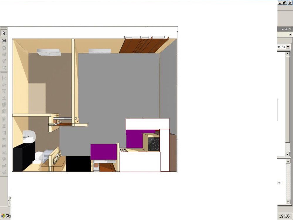 Zrobiłam coś takiego w paincie (niech zyją zdolności manualne), ale nie jestem pewna co do paneli pod lodowka, poza tym nie wiem czy by nie wypadly np. w połowie lodówki, czego bym nie chciała.... Oczywiście szare to panele, fiolet to kafelki, białe zabudowa kuchenna, wszystko mniej więcej, bo wlasnie odkryłam, ze projektant kuchni nie odliczył 30cm. na komin ehhh..... -