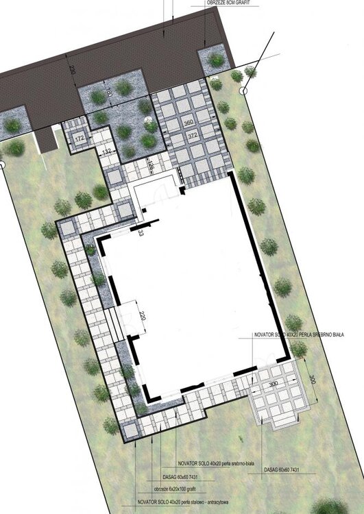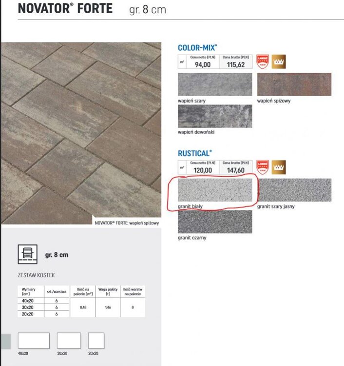 Pani projektantka przedstawiła swoją wizję na podjazd. Nie za bardzo pasuje mi front. Część z podjazdem do garażu jest za szeroka - przy 412 cm płyty zachodzą na otwór szamba. Usunę też te mini rabatki przed garażem, tak jak radzi pestka56. Zobaczymy jak wyjdzie spadek od garażu i wtedy zdecyduję czy dajemy donicę. Schody przy drzwiach frontowych chcieli mi skuć. Zdecydowaliśmy, że nie dajemy płyt brukowych tylko kamieniarz zrobi schody z granitu, takiego jak mam na parapetach zewnętrznych. Ścieżka od furtki też mi sie nie podoba. A już najmniej podoba mi się to, że płyty 80x80 mają grubość 8cm, a te małe 16x24 tylko 6cm. Trzeba zmienić koncepcję - krata odpada. Wybieram płyty 80x80x8 (perła) oraz 50x50x8 (Dasag 7431) i jako dodatki 40x20x8 (perła). Tytan biały odpada. Teraz będą kwadraciki i paski.