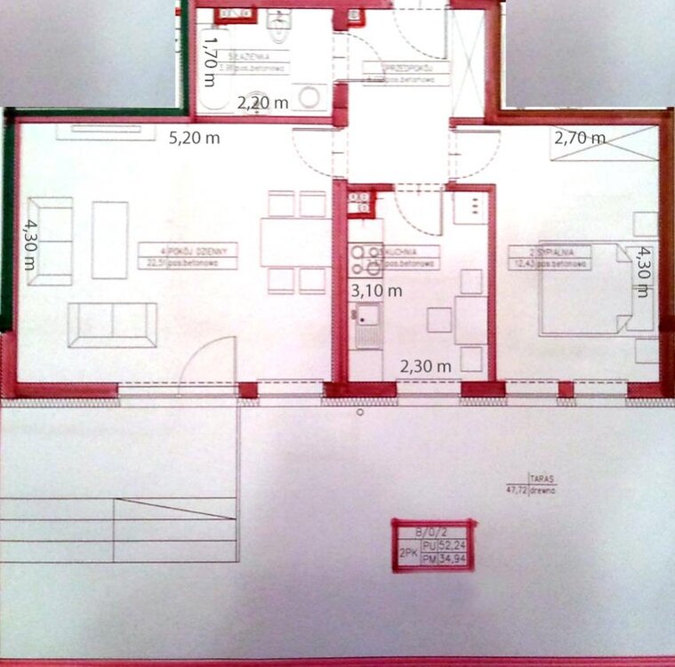 Mam prośbę odnośnie pomocy w urządzeniu mieszkania. Zakupiliśmy mieszkanie o powierzchni 52m2, niestety układ mieszkania nie należy do idealnych. Z racji na fakt iż w naszej miejscowość nowych mieszkań praktycznie się nie buduje zdecydowaliśmy się na zakup. Aktualnie zastanawiamy się nad przeniesieniem kuchni do salonu w celu uzyskania jeszcze jednego pokoju. Na pewno największym mankamentem będzie ciemny korytarz i brak przestronności po wejściu do mieszkania. Będę wdzięczny za każdą propozycję. Poniżej rzut mieszkania.