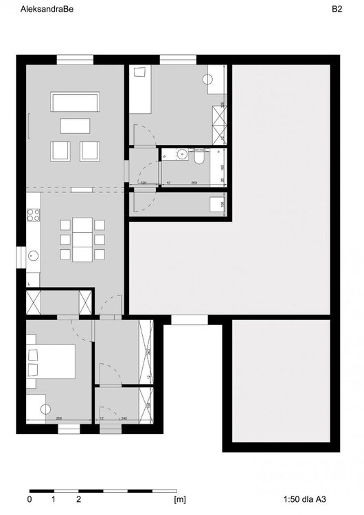 wersja B1 połączenie kuchni z salonem (wskazane dodatkowe okna jak w poprzedniej wersji), sypialnie rozmieszczone na biegunach mieszkania.