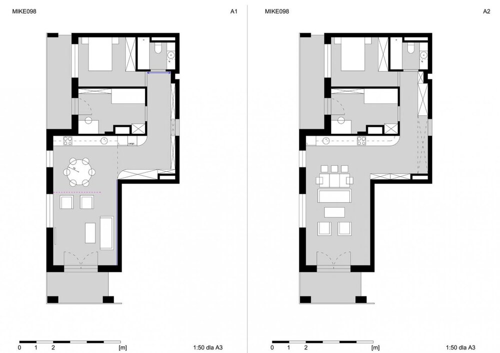 Witam, w zasadzie masz układ bez zastrzeżeń, ale zawsze jakiś drobiazg można poprawić, proponuję: -korektę łazienki (likwidacja wnęki na pralkę; hall będzie foremny) -prosty ciąg kuchenny (wg. mnie 3mb na kuchnie wystarczy; zyskujesz normalny wolnostojący stół z 4-5 krzesłami). -jeden pas zabudowy z hallu do kuchni (klarowny układ) -poszerzenie hallu o 20cm kosztem środkowego pokoju. Ciąg L czy prosty ciąg to kwestia upodobań. Z prostym masz swobodę ustawienia stołu (a salon jest mały). Zabudowa L to ograniczy (zyskasz 100cm na ścianie, a "stracisz" 60 na niewygodny róg; poza tym masz 3 krzesła, a w prostym ciagu normalny wolnostojacy stół).